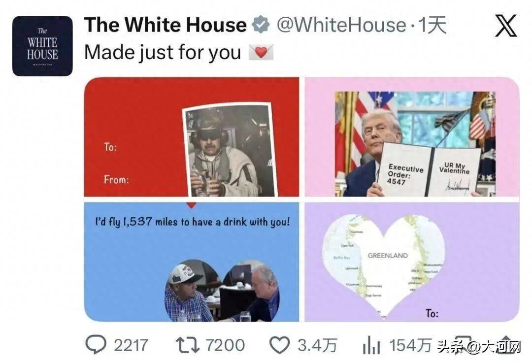 2月14日西方情人节之际,美国白宫在社交媒体平台X发布了一组“只为你设计”的贺卡,其中包括“被爱心包围”的格陵兰岛等视觉元素。这组贺卡引发争议,不少网友直指白宫这样做“不合适”,质疑美国政府官员不当使用社交媒体。