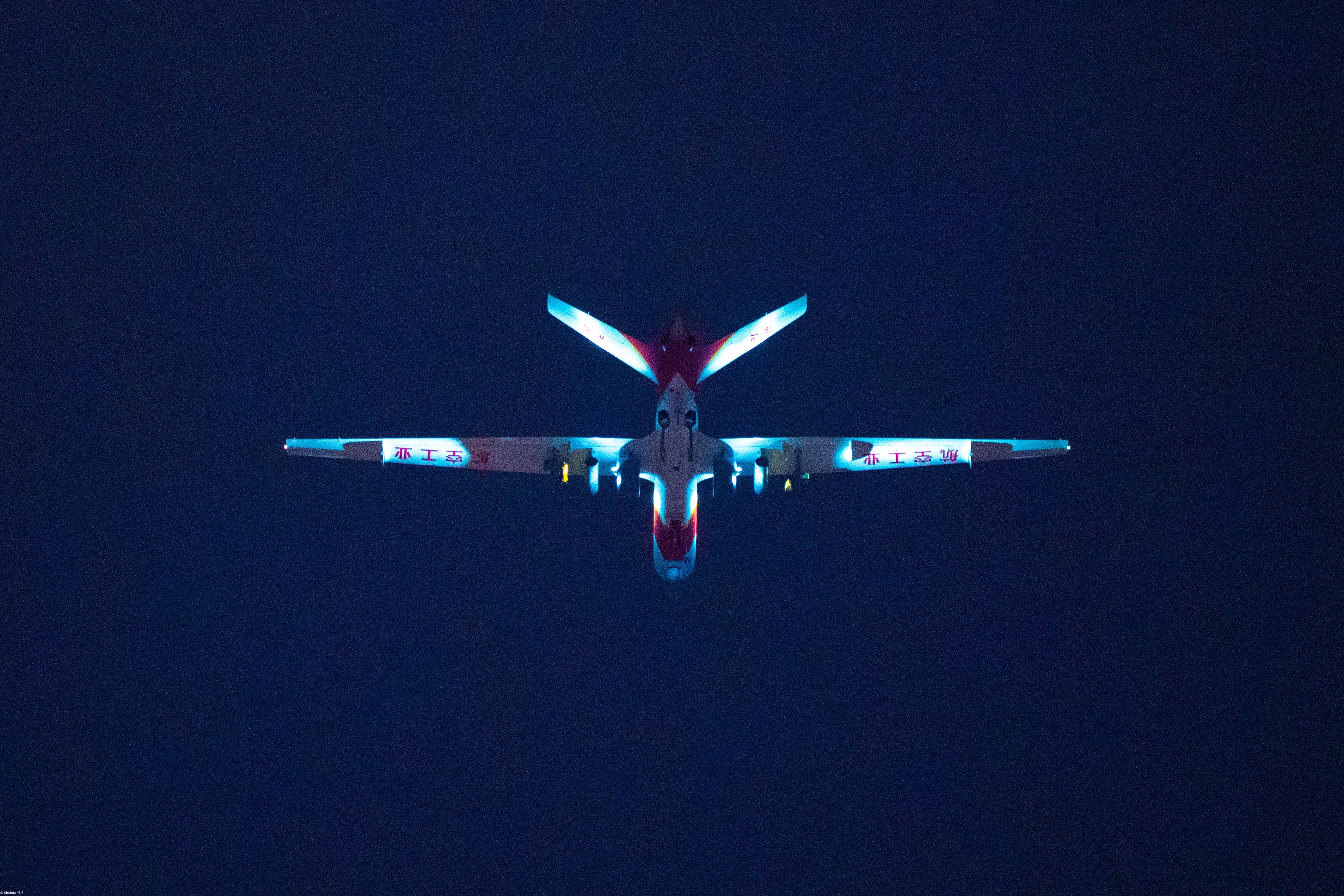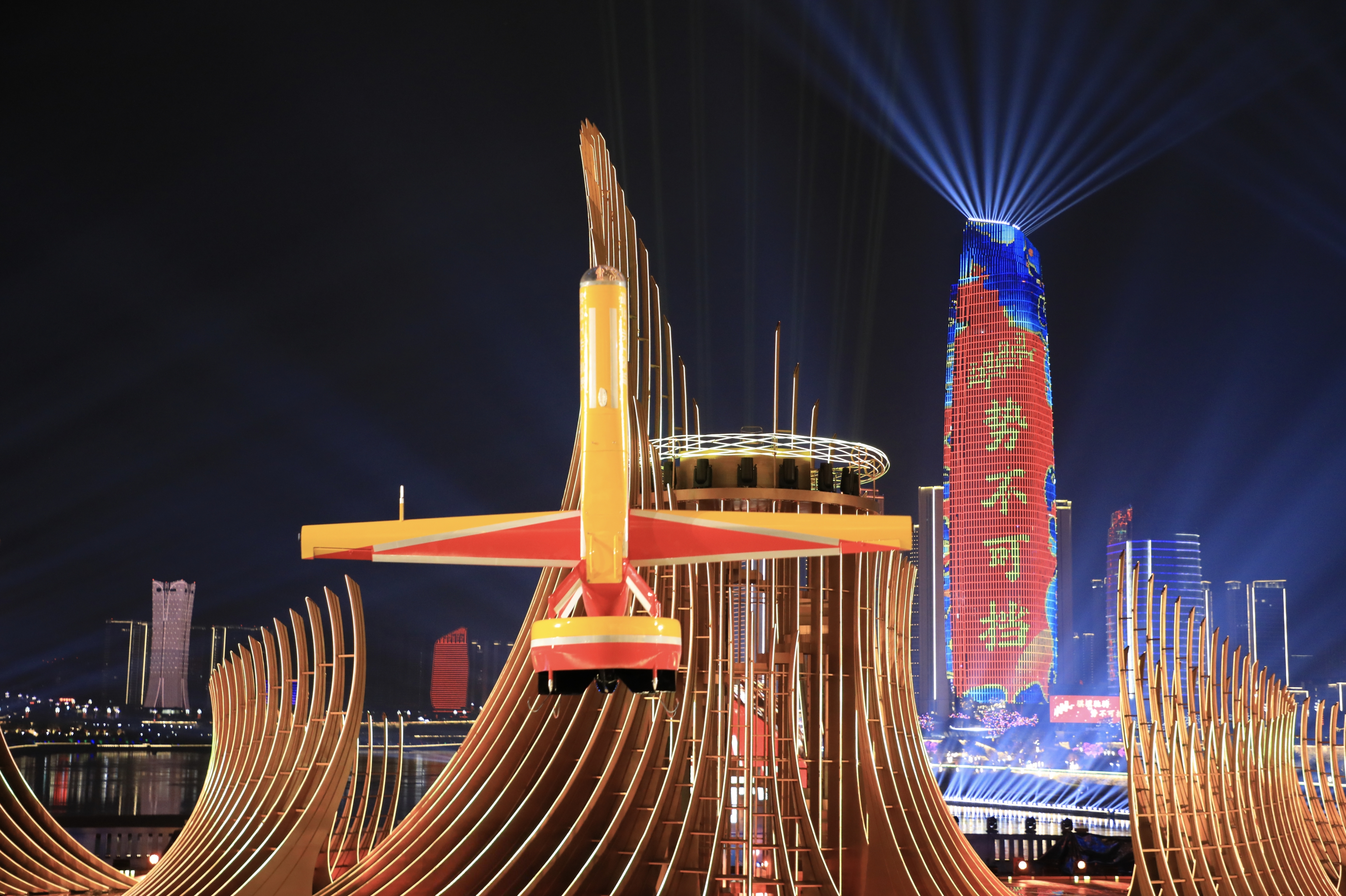 “起飞!”一声令下,10架“云影”无人机拔地而起,直冲天际,又迅速改平,沿江飞去,10机组成楔形编队在江面上整齐盘旋翱翔。只见“翼龙”如约而至,闪烁着明亮的灯光呼啸而来、气势磅礴。两型无人机和舞台、江景融为一体,构成了一幅辽远壮阔的万里江山图。
